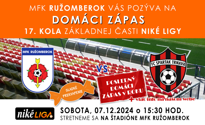 Pozývame priaznivcov futbalu na domáci futbalový zápas 17.kola Niké ligy. MFK Ružomberok privíta na štadióne Pod Čebraťom „obávaného“ súpera FC Spartak Trnava. Príďte podporiť našich futbalistov, potrebujú podporu fanúšikov, ktorí ich poženú k víťaznému výkonu. Zápas sa odohrá v sobotu 7.decembra o 15.30 hod.. Príďte, čaká Vás aj sladké prekvapenie.