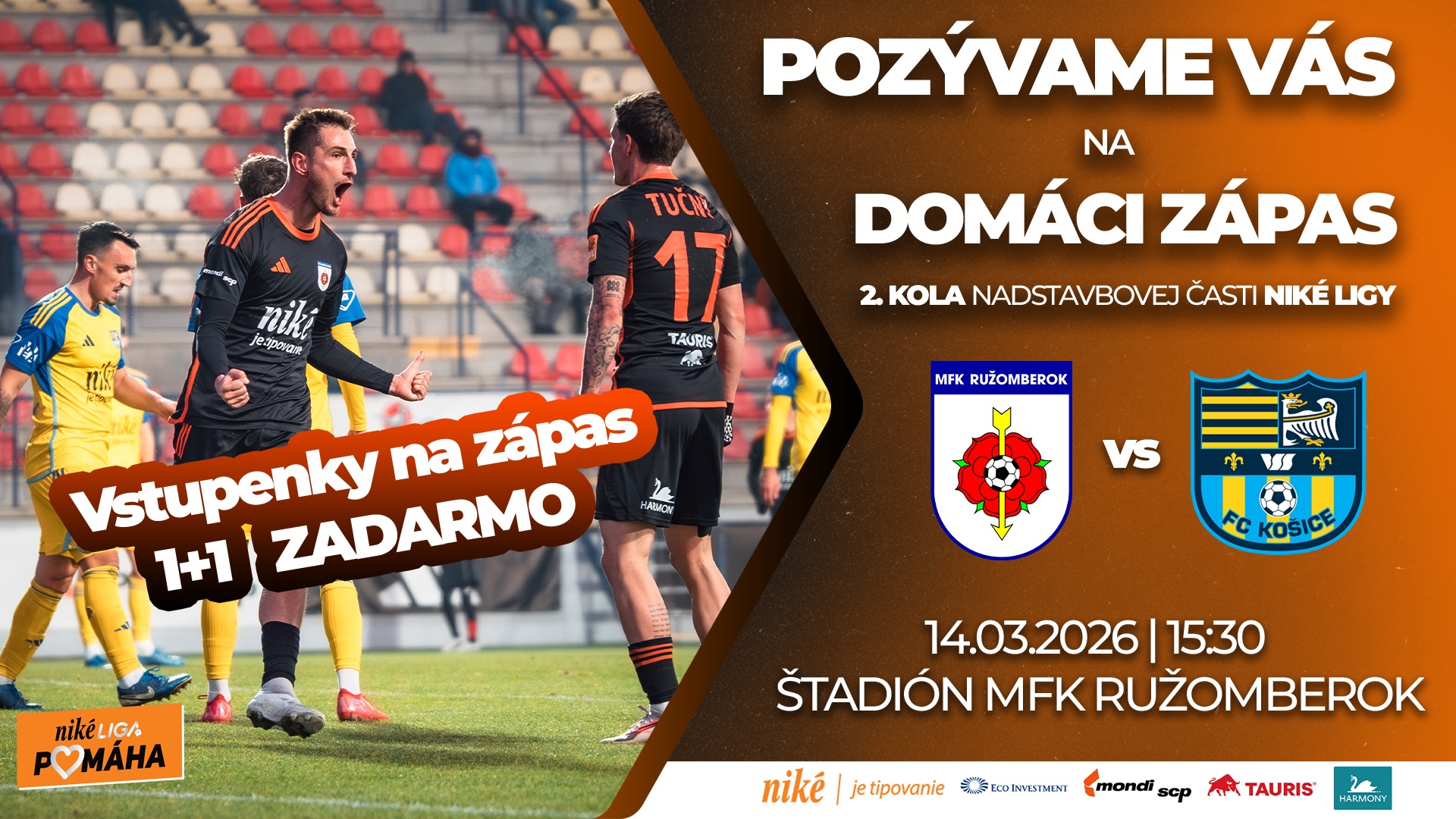 Pozývame priaznivcov futbalu na zápas 2.kola Nadstavbovej časti Niké Ligy. V sobotu 14. marca 2026 o 15:30 hod. sa odohrá stretnutie MFK Ružomberok a FK Košice. Podpora z tribún je pre našich futbalistov dôležitá. Aj my – fanúšikovia hráme s nimi o každý bod. Svojou účasťou podporíme aj organizáciu IPčko, ktorá sa zaoberá problematikou duševného zdravia a poskytuje (nielen) krízovú psychologickú pomoc. Hlavným cieľom IPčka je aby nikto nebol na problémy sám. Preto je na tento zápas pripravená akcia: 1+1 lístok zadarmo. Vstup zadarmo majú aj deti do 15 rokov. Počas polčasovej prestávky súťaž o marketingové predmety MFK. Na štadióne zabezpečená ponuka dobrého občerstvenia aj teplých nápojov. Pre viac informácií čítajte na: https://www.mfkruzomberok.sk/