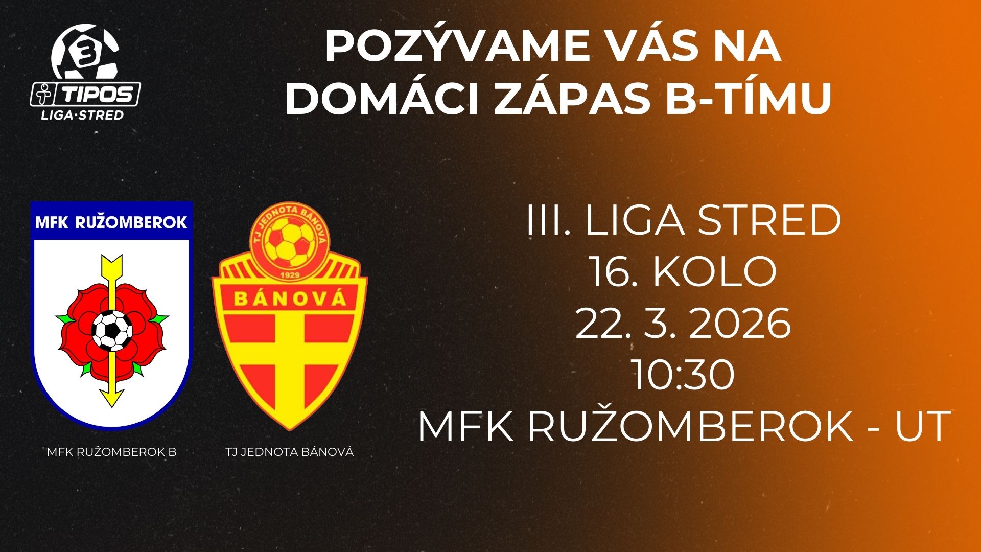 Priaznivcov futbalu pozývame na zápas 16. kolo TIPOS III. Ligy Stred – MFK Ružomberok / TJ Jednota Bánová, ktoré sa hrá v nedeľu 22. 3. 2026 o 10.30 hod. Súper TJ Jednota Bánová uzatvára tabuľku s doposiaľ nazbieranými 6 bodmi. Stretnutie sa odohrá na umelej tráve ružomberského štadióna. Vstup na zápas je zadarmo. Pre viac informácií naďalej sledujte náš web https://www.mfkruzomberok.sk/