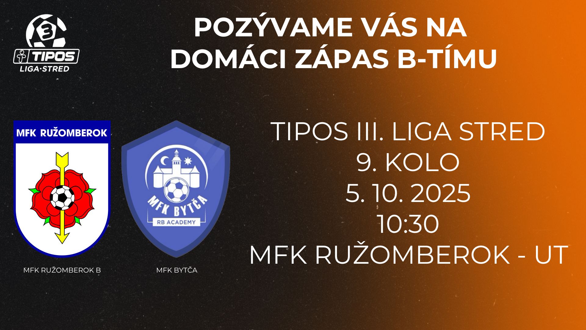 V 9. kole TIPOS III. Ligy Stred sa naši futbalisti stretnú s mužstvom, ktorému v tabuľke patrí 6.priečka. Pozývame priaznivcov ružomberského futbalu povzbudiť naše mužstvo. K víťazstvu je potrebná aktívna podpora z tribún. Zápas MFK Ružomberok / MFK Bytča sa odohrá 5.10.2025 o 10.30 hod. na umelej tráve ružomberského štadióna. Vstup na zápas je zadarmo. Viac informácií nájdete na: https://www.mfkruzomberok.sk/