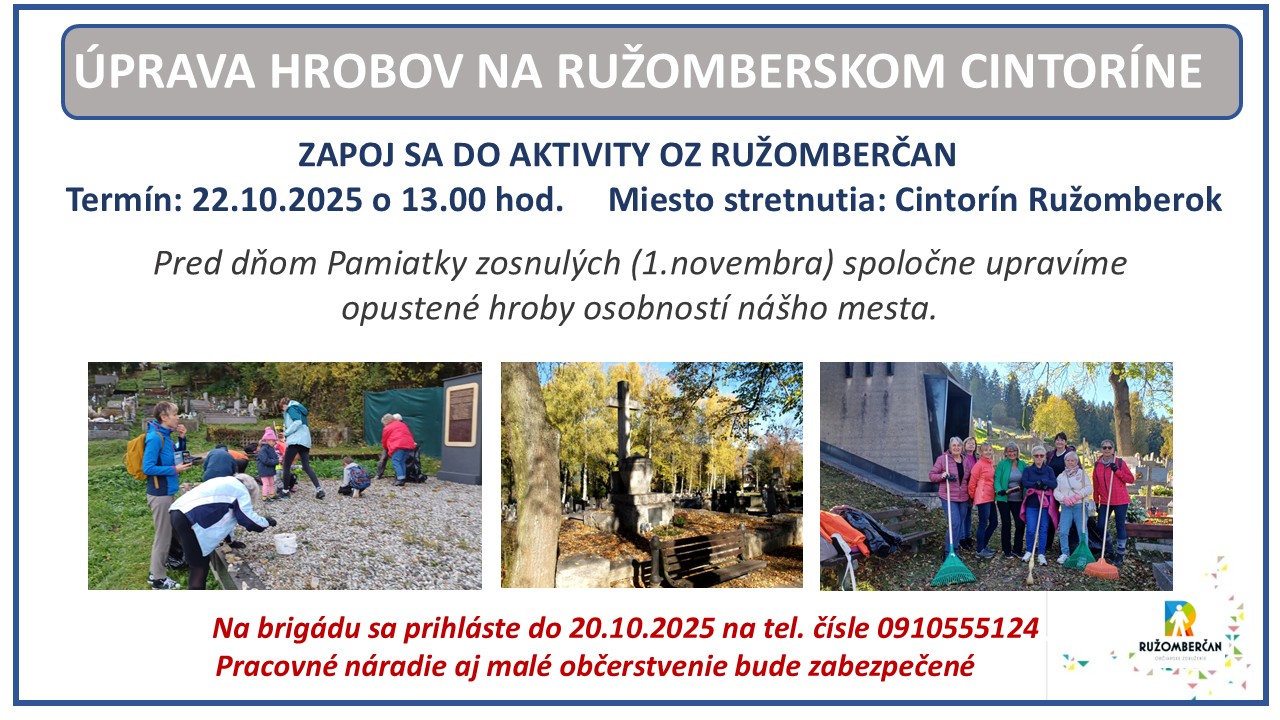 Jedna z tradičných aktivít OZ Ružomberčan je čistenie a upravenie hrobov ružomberských osobností, ktoré odpočívajú na ružomberskom hlavnom cintoríne. Pozývame členov ale aj sympatizantov združenia, aby prišli pomôcť skrášliť cintorín pred Dušičkami. V sprievode dospelých môžu prísť aj deti, takto majú možnosť spoznať významné osobností nielen pre Ružomberok. Brigáda sa uskutoční 22.10.2025 (štvrtok) o 13:00 hod. Je potrebné prihlásiť sa do 20.10.2025. Podľa počtu prihlásených zabezpečujeme pracovná náradie a občerstvenie.